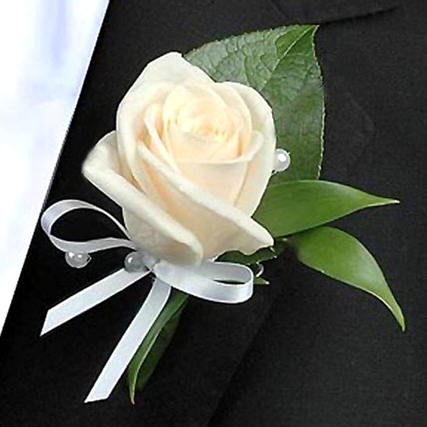 • Boutonniere with single light peach rose and single ruscuss leaves.