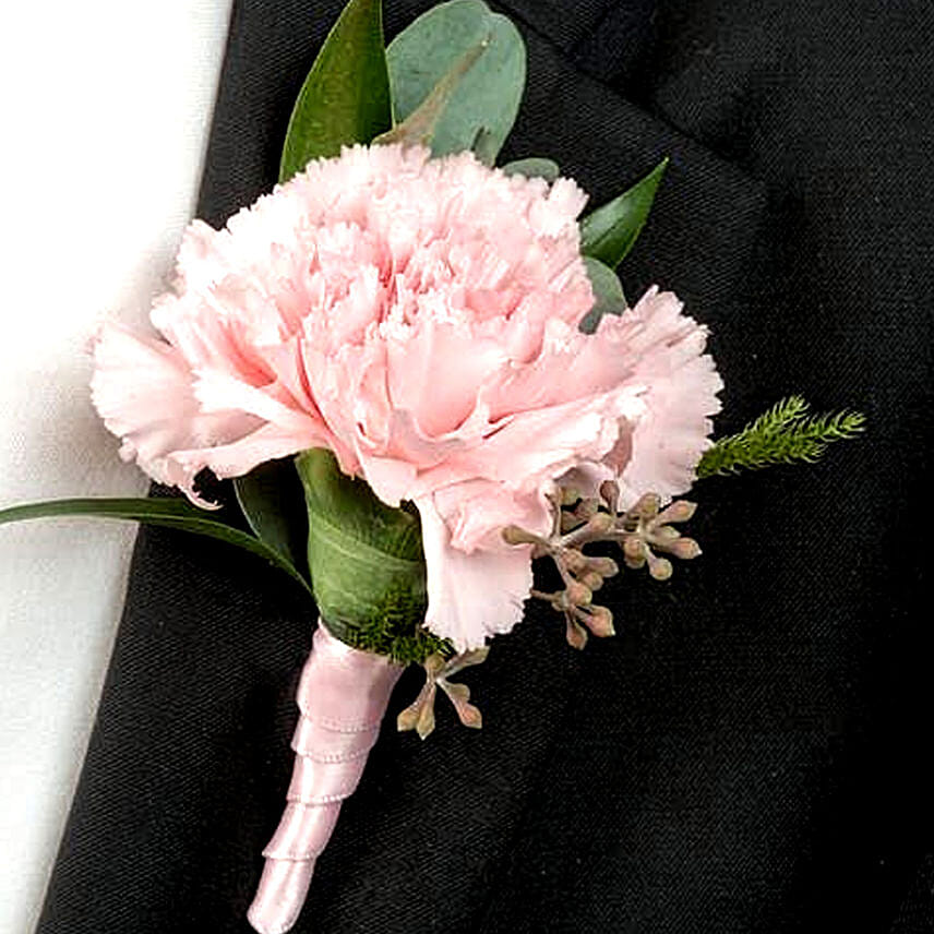 • Boutonniere with single pink carnation, lepidium flowers and single ruscuss leaves.