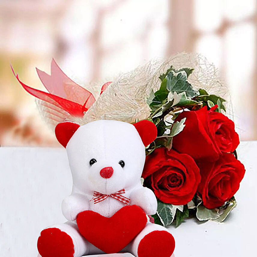 The matter of heart is best expressed through lovey dovey items like flowers and teddy bear. Let this awesome combo of red roses bouquet and white teddy become the carrier of your romantic feelings for your sweetheart. She will be highly glad to receive it from your end as a token of love and affection.